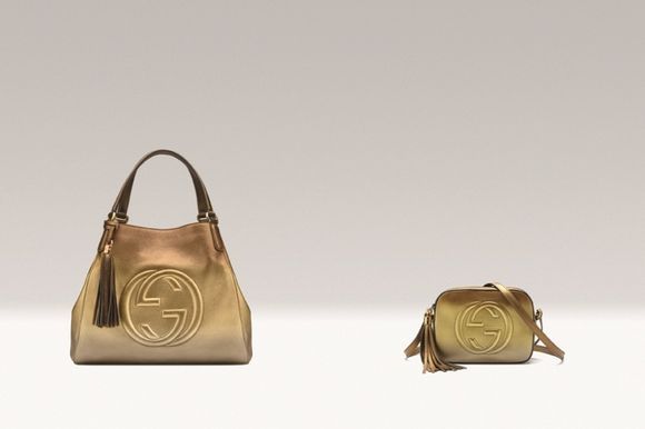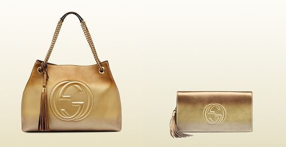 구찌의 소호 라인 핸드백은 엠보싱과 스티칭으로 완성된 브랜드 고유의 인터라킹 GG로고가 특징으로, 메탈릭 샴페인 컬러와 가죽 태슬 장식이 더해졌다.