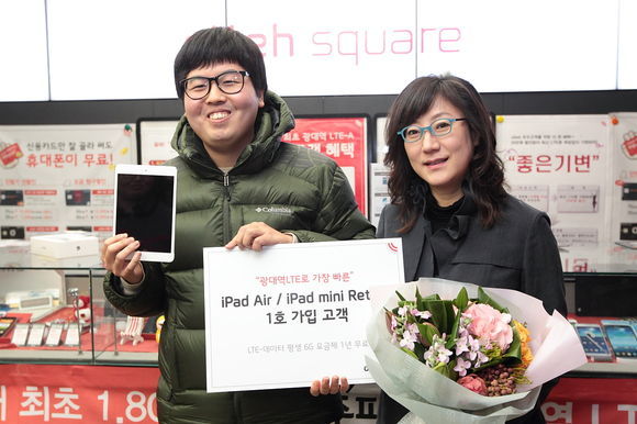 KT 마케팅본부장 박혜정 전무는 이날 올레스퀘어에서 1호 개통 가입자인 윤병선씨에게 축하 꽃다발과 함께 'LTE 데이터평생 6G' 요금 1년 무료 이용권과 벨킨 액세서리 세트를 직접 전달했다.