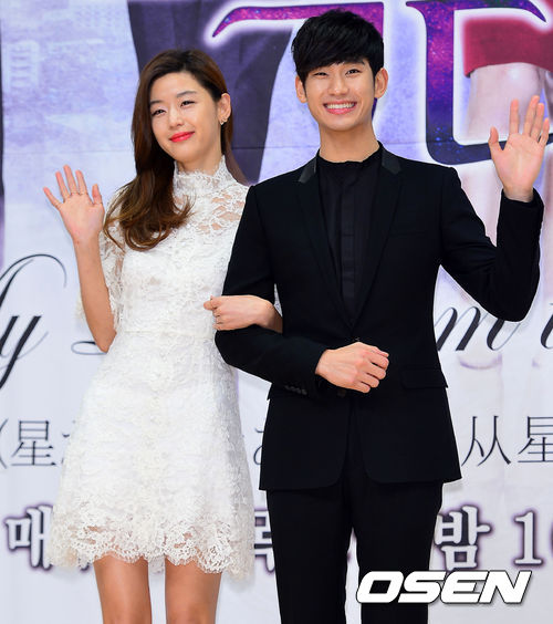 16일 오후 서울 양천구 목동 SBS 사옥에서 열린 SBS 새 수목드라마 '별에서 온 그대'(연출 장태유, 극본 박지은) 제작발표회, 전지현과 김수현이 무대 위에서 포토타임을 갖고 있다.