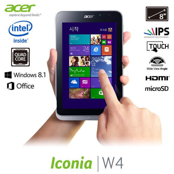에이서의 ‘아이코니아 W4’는 국내 최초의 8인치 윈도우 태블릿으로, 인텔 아톰 Z3740 프로세서(베이트레일)와 64GB SSD, IPS HD 디스플레이(1280x800 해상도)를 제공한다. 최대 10시간 까지 사용 가능한 배터리와 415g의 가벼운 무게로 최고의 사용감을 제공한다. 지난 9일 국내 출시돼 초판 물량 500대가 매진된 바 있다.