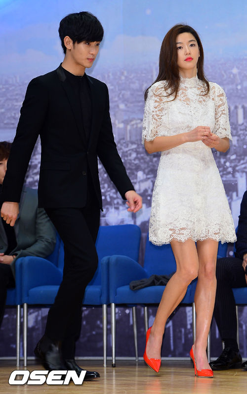 16일 오후 서울 양천구 목동 SBS 사옥에서 열린 SBS 새 수목드라마 '별에서 온 그대'(연출 장태유, 극본 박지은) 제작발표회, 전지현과 김수현이 무대 앞으로 걸어나오고 있다.