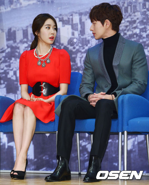16일 오후 서울 양천구 목동 SBS 사옥에서 열린 SBS 새 수목드라마 '별에서 온 그대'(연출 장태유, 극본 박지은) 제작발표회, 유인나와 박해진이 자리에 앉아서 얘기를 나누고 있다.