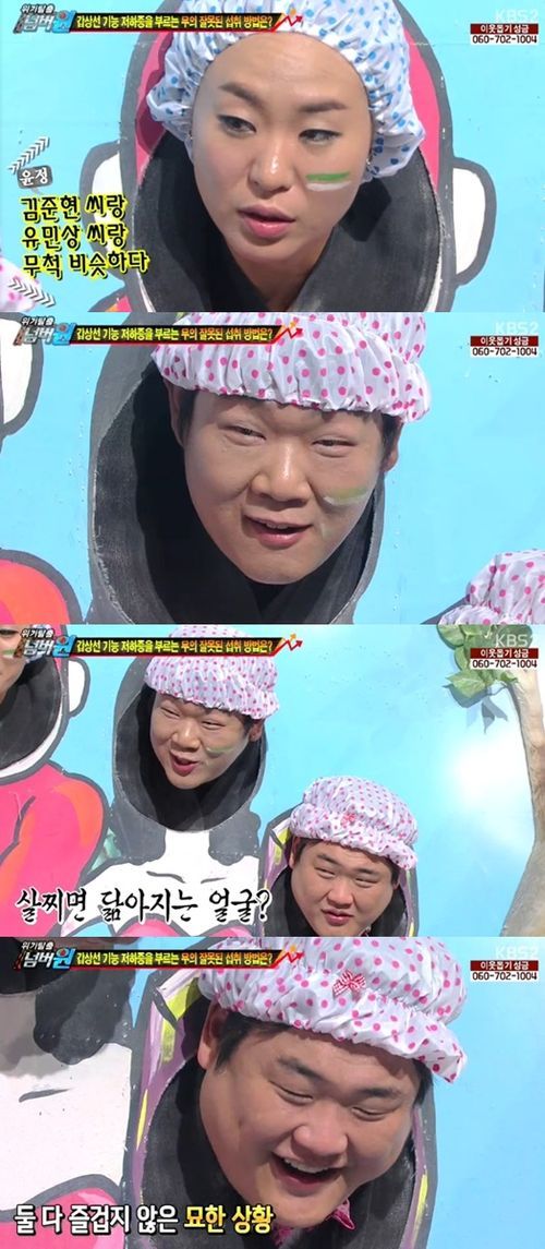 특히 벌칙판에 헤어캡을 쓰고 얼굴을 드러낸 유민상과 김준현이 유독 닮은 모습으로 웃음을 자아냈다. MC 장윤정은 "둘이 너무 닮았다"고 말했고 김종국도 "살찌면 닮아지는 것 아니냐"라고 거들어 관심을 끌었다.