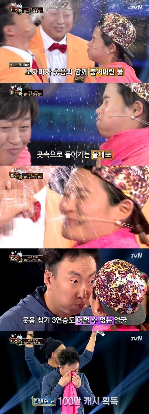 이날 김신영은 정준하 팀을 대표해 MC를 이겨라 게임에 나섰다. 대결 종목은 물 머금고 웃음참기.