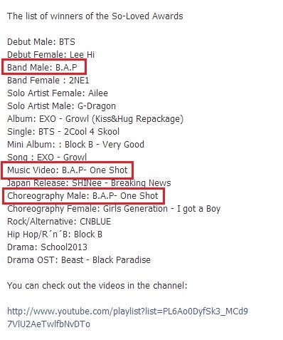 유럽 제 4회 ‘소 러브드 어워즈(So-Loved Awards)’에서 B.A.P는 베스트 남자 그룹상과 함께, 두 번째 미니 앨범 ‘원샷(ONE SHOT)’으로 뮤직비디오상과 남자 안무상을 수상했다. 총 18개의 부문 중에서 3개 부분의 수상을 확정 지은 이들은 올해의 ‘최다 부문 수상’이라는 영예로운 타이틀까지 함께 얻으며 ‘글로벌 케이팝 신성’다운 면모를 드러냈다.