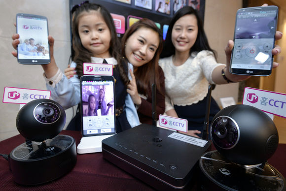 LG유플러스가 17일 서울 마포구 서교동 자이갤러리에서 외부에서도 스마트폰을 통해 집안을 모니터링 할 수 있는 맘(마음, Mom) 편한 카메라, '맘카 홈CCTV'를 선보이고 있다. /LG유플러스 제공.