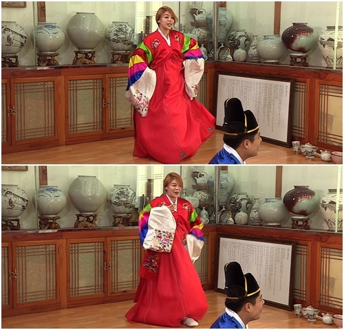 이에 에일리는 벌떡 일어나 전통혼례복을 입은 채로 자신의 히트곡 ‘보여줄게’를 완벽한 안무와 함께 열창하기 시작했다. 시댁 식구들은 온 집안을 쩌렁쩌렁 울리는 에일리의 폭풍성량과 한복 소매를 펄럭이면서도 무대보다 더 열심히 안무를 소화하는 그의 모습에 매우 놀랐다.