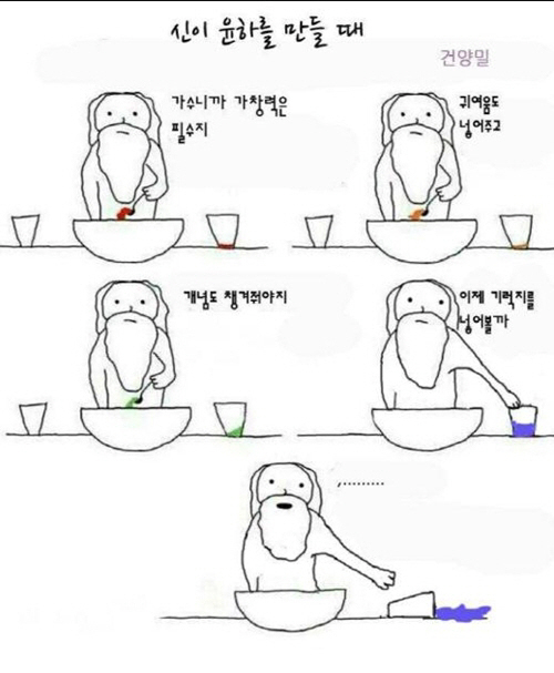 이 게시물에 따르면 신은 '가수니까 가창력은 필수지', '귀여움도 넣어주고', '개념도 챙겨줘야지'라며 윤하를 만든다. 그리고 '이제 기럭지를 넣어볼까'라며 컵을 드는 순간 엎지르면서 끝난다.