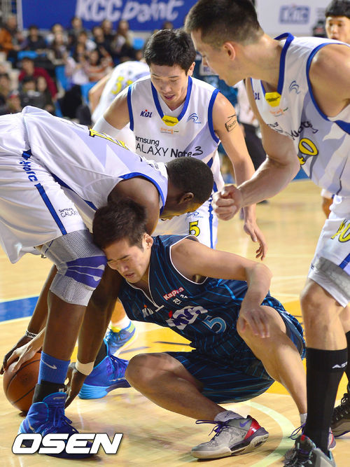 17일 오후 전북 전주실내체육관서 열린 '2013-14시즌 KB국민카드 프로농구' 전주 KCC와 서울 삼성의 경기, 1쿼터 KCC 정의한이 삼성 더니건에게 공을 빼앗기고 있다.