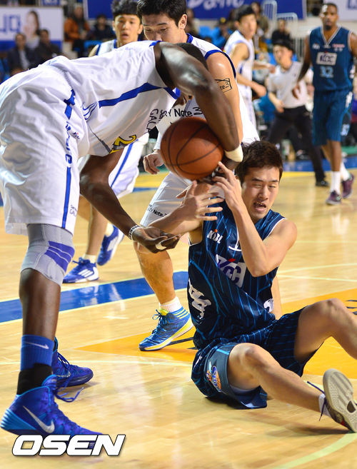 17일 오후 전북 전주실내체육관서 열린 '2013-14시즌 KB국민카드 프로농구' 전주 KCC와 서울 삼성의 경기, 1쿼터 KCC 정의한이 삼성 더니건에게 공을 빼앗기고 있다.