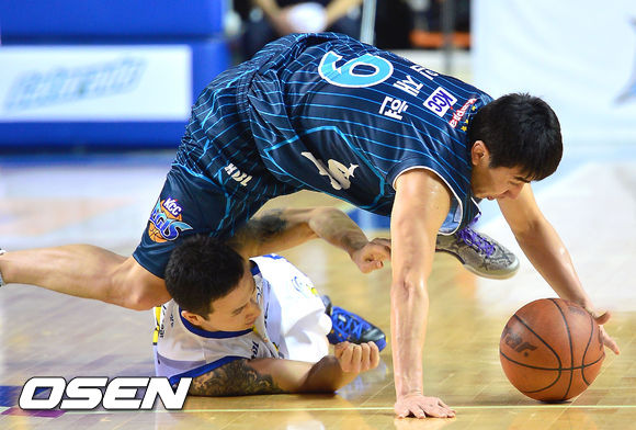 17일 오후 전북 전주실내체육관서 열린 '2013-14시즌 KB국민카드 프로농구' 전주 KCC와 서울 삼성의 경기, 2쿼터 KCC 임재현이 삼성 김승현의 공을 빼앗고 있다.