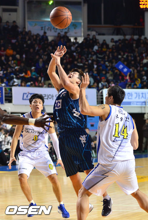 17일 오후 전북 전주실내체육관서 열린 '2013-14시즌 KB국민카드 프로농구' 전주 KCC와 서울 삼성의 경기, 2쿼터 KCC 박경상이 삼성에게 파울을 얻어내고 있다.