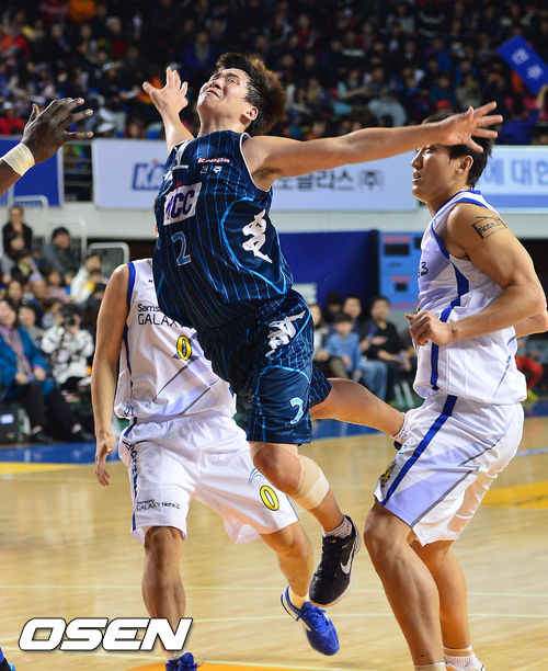 17일 오후 전북 전주실내체육관서 열린 '2013-14시즌 KB국민카드 프로농구' 전주 KCC와 서울 삼성의 경기, 2쿼터 KCC 박경상이 삼성에게 파울을 얻어내고 있다.