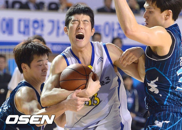 17일 오후 전북 전주실내체육관서 열린 '2013-14시즌 KB국민카드 프로농구' 전주 KCC와 서울 삼성의 경기, 4쿼터 삼성 임동섭이 KCC 박경상에게 파울을 얻어내고 있다.