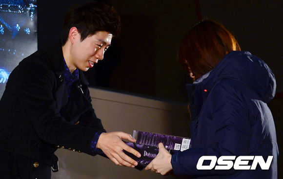 임요환이 이벤트에 당첨된 여성팬에게 선물을 건네고 있다.