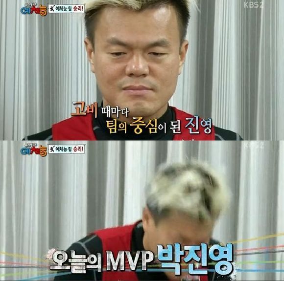 지난 17일 오후 방송된 KBS 2TV 예능 프로그램 '우리동네 예체능' 한일 교류전에서 한국이 승리한 가운데 박진영이 MVP에 선정됐다.