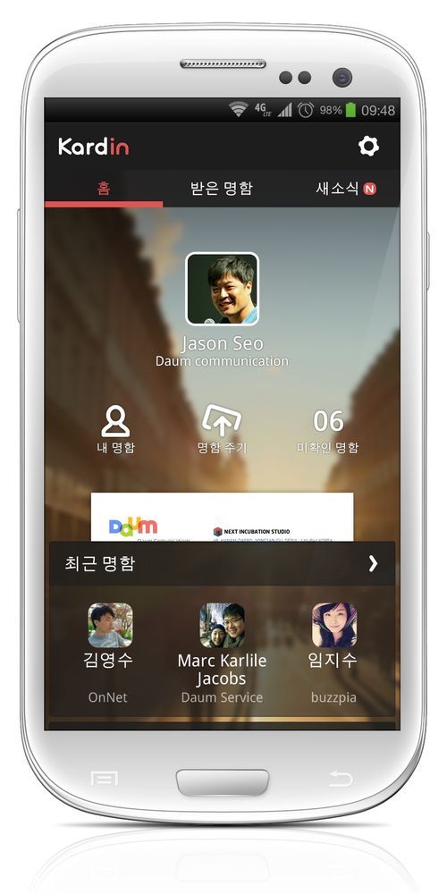 다음커뮤니케이션의 벤처 육성 조직인 다음 넥스트 인큐베이션 스튜디오(이하 다음 NIS)는 명함을 쉽게 공유하고 관리할 수 있는 모바일 소셜 명함 애플리케이션 ‘카드인(Kardin)’을 구글 플레이에 출시했다.