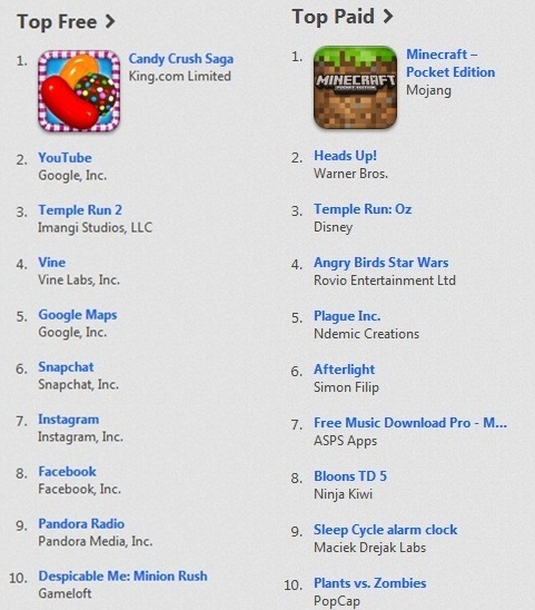 마인크래프트의 포켓에디션이 1위를 차지했으며 워너브라더스의 헤즈업이 2위로 뒤를 이었다. 3위와 4위는 템플런과 앵그리버드 스타워즈가 올랐다.