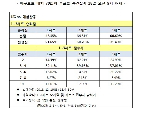 국민체육진흥공단(www.kspo.or.kr)이 발행하는 체육진흥투표권 수탁사업자인 스포츠토토의 공식 온라인 발매사이트 베트맨(www.betman.co.kr)은 오는 19일(목) 열리는 2013-2014시즌 V-리그 LIG-대한항공전을 대상으로 하는 배구토토 매치 70회차 게임 투표율 중간집계 결과, 배구팬들은 대한항공이 LIG를 상대로 우세한 경기를 펼칠 것으로 예상했다.