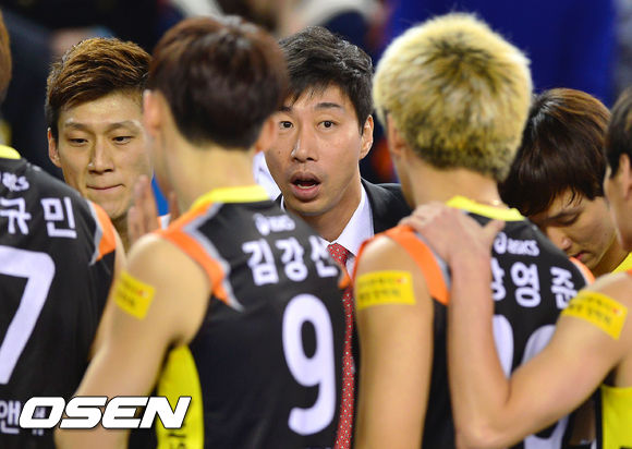 18일 오후 천안유관순체육관에서 열린 '2013-14 시즌 NH농협 V리그' 남자부 현대캐피탈과 러시앤캐쉬의 경기에 앞서 러시앤캐쉬 김세진 감독이 선수들과 이야기를 나누고 있다.