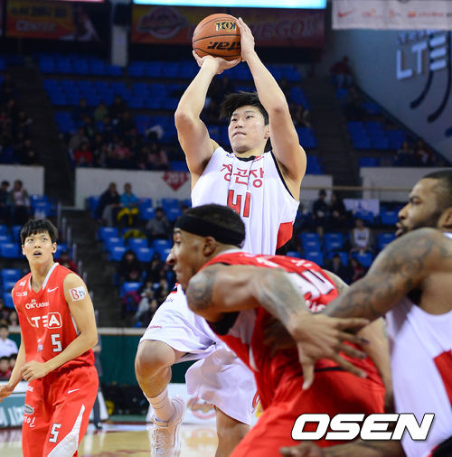18일 오후 서울 잠실학생체육관에서 열린 '2013-2014 KB국민카드 프로농구' 서울 SK와 안양 KGC인삼공사의 경기 1쿼터 오세근이 슛을 시도하고 있다.