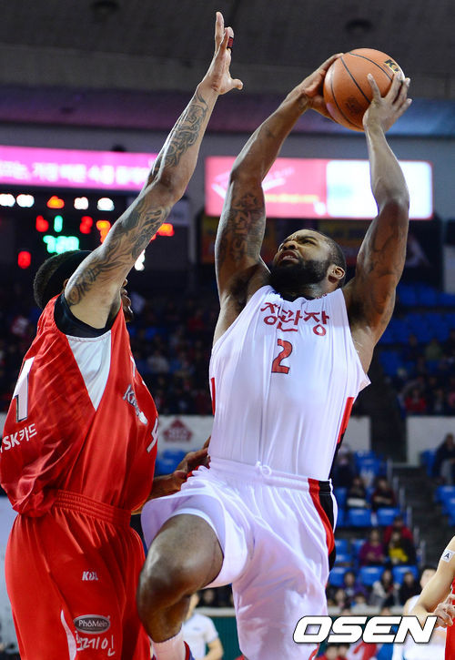 18일 오후 서울 잠실학생체육관에서 열린 '2013-2014 KB국민카드 프로농구' 서울 SK와 안양 KGC인삼공사의 경기 1쿼터 에반스가 심스를 앞에두고 슛을 시도하고 있다.