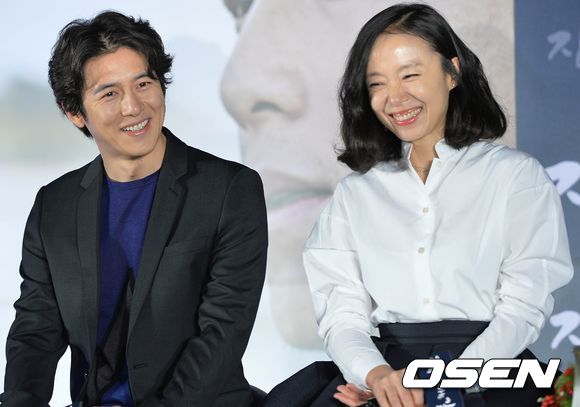 배우 전도연과 고수가 인사말 전하며 미소짓고 있다.