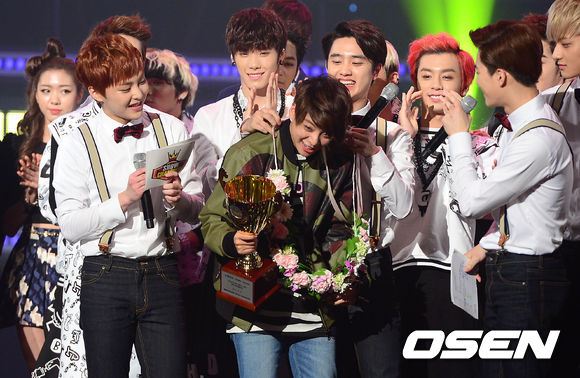 18일 오후 경기도 고양시 일산 장항동 빛마루 방송지원센터에서 진행된 MBC MUSIC '쇼 챔피언'에서 그룹 EXO 멤버들이 에프엑스 엠버의 마지막 방송을 격려하며 꽃목걸이를 걸어주고 있다.