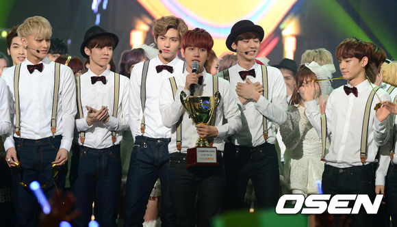 18일 오후 경기도 고양시 일산 장항동 빛마루 방송지원센터에서 진행된 MBC MUSIC '쇼 챔피언'에서 1위를 차지한 그룹 EXO가 수상소감을 말하고 있다.