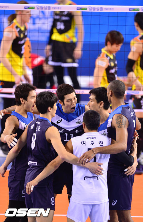 18일 오후 천안유관순체육관에서 열린 '2013-14 시즌 NH농협 V리그' 남자부 현대캐피탈과 러시앤캐쉬의 경기, 2세트 현대캐피탈 최만호가 공격 성공 후 동료들과 즐거워하고 있다.