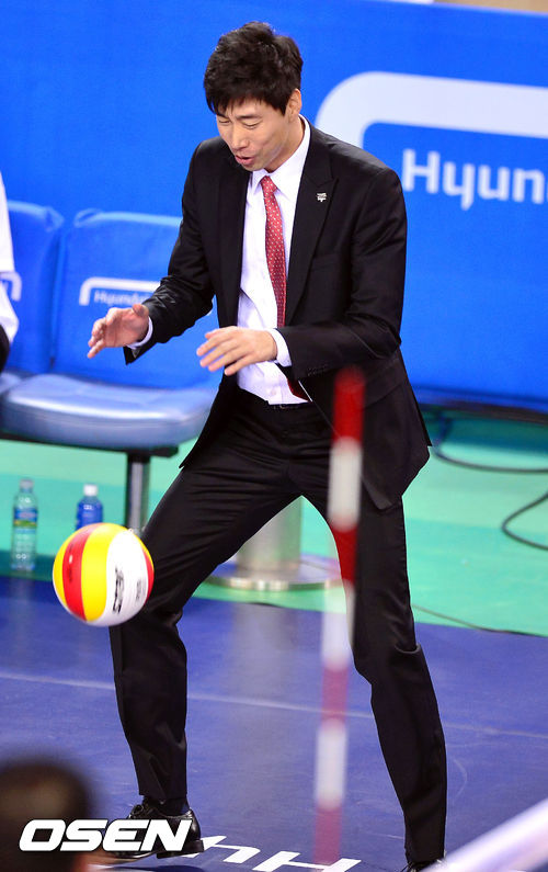 18일 오후 천안유관순체육관에서 열린 '2013-14 시즌 NH농협 V리그' 남자부 현대캐피탈과 러시앤캐쉬의 경기, 1세트 러시앤캐쉬 김세진 감독이 터치아웃되는 공을 바라보며 아쉬워하고 있다.