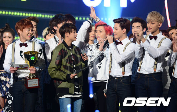 18일 오후 경기도 고양시 일산 장항동 빛마루 방송지원센터에서 진행된 MBC MUSIC '쇼 챔피언'에서 1위를 차지한 그룹 EXO가 수상소감을 말하고 있다.