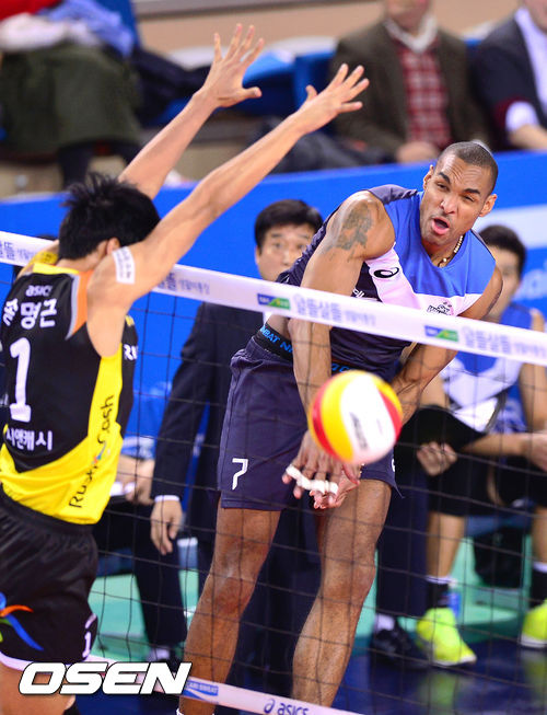 18일 오후 천안유관순체육관에서 열린 '2013-14 시즌 NH농협 V리그' 남자부 현대캐피탈과 러시앤캐쉬의 경기, 1세트 현대캐피탈 아가메즈가 강타를 날리고 있다,