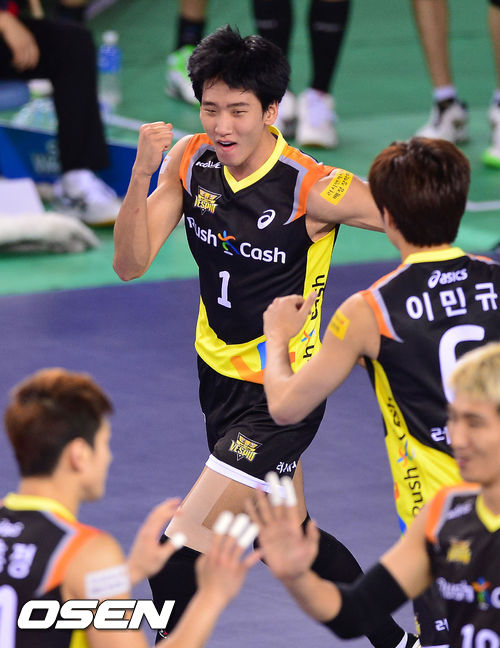 18일 오후 천안유관순체육관에서 열린 '2013-14 시즌 NH농협 V리그' 남자부 현대캐피탈과 러시앤캐시의 경기, 2세트 러시앤캐시 송명근이 공격 성공후 환호하고 있다.