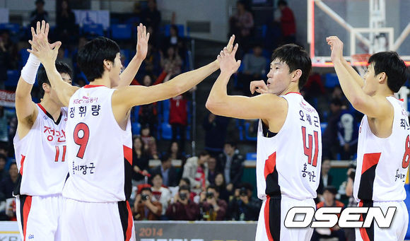 18일 오후 서울 잠실학생체육관에서 열린 '2013-2014 KB국민카드 프로농구' 서울 SK와 안양 KGC인삼공사의 경기 종료 후 인삼공사 선수들이 승리를 기뻐하고 있다.