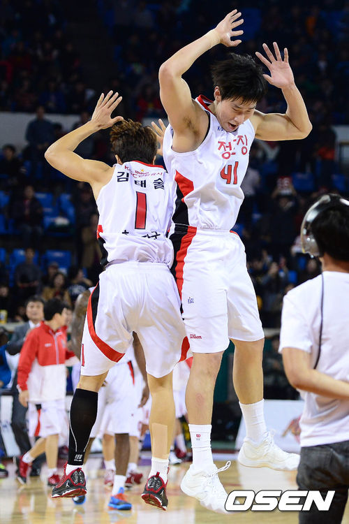 18일 오후 서울 잠실학생체육관에서 열린 '2013-2014 KB국민카드 프로농구' 서울 SK와 안양 KGC인삼공사의 경기 종료 후 오세근과 김태술이 세레모니를 하고 있다.