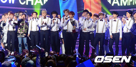 18일 오후 경기도 고양시 일산 장항동 빛마루 방송지원센터에서 진행된 MBC MUSIC '쇼 챔피언'에서 1위를 차지한 그룹 EXO가 소감을 말하고 있다.