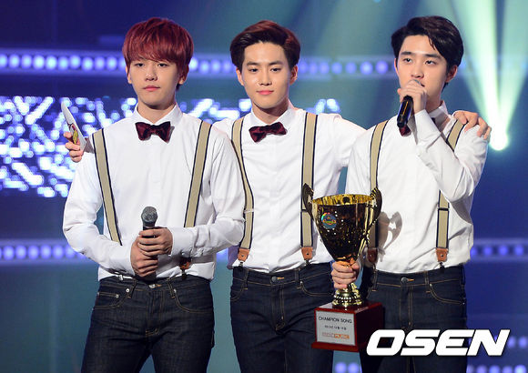 18일 오후 경기도 고양시 일산 장항동 빛마루 방송지원센터에서 진행된 MBC MUSIC '쇼 챔피언'에서 1위를 차지한 그룹 EXO 백현, 수호, 디오가 앙코르무대를 펼치고 있다.