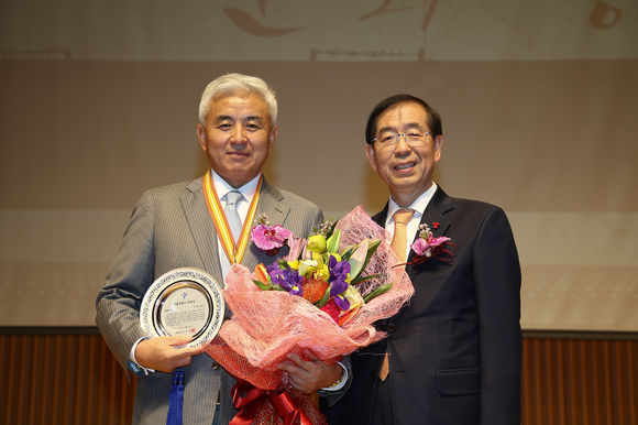 주원홍 대한테니스협회 회장이 18일 오후 2시 서울시청 다목적홀에서 열린 제 62회 서울시 문화상 시상식에서 박원순 서울시장으로부터 상패와 메달을 받았다.