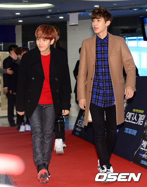 그룹 EXO 백현과 찬열이 레드카펫 행사를 갖고 있다.