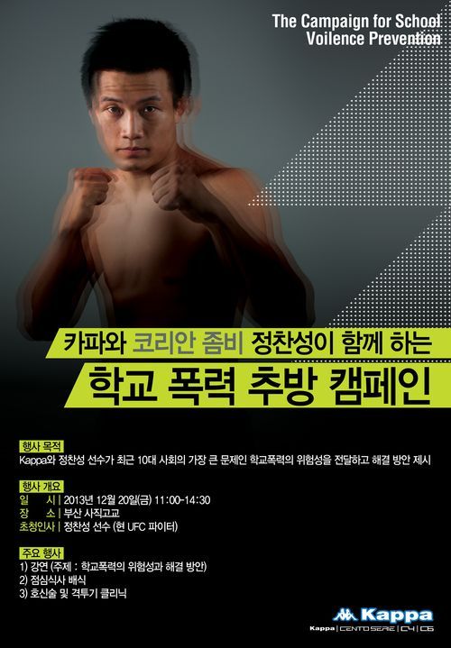 이탈리아 정통 스포츠 브랜드 카파와 '코리안 좀비' 정찬성(26, 코리안좀비 MMA)이 학교폭력 예방을 위해 손을 잡는다.