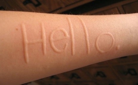 피부묘기증이란 두드러기의 일종으로 피부를 어느 정도 이상의 압력을 주어 긁거나 누르면 그 부위가 붉게 변하면서 부어오르는 현상을 말한다. 그래서 마치 피부에 글씨를 쓴 것 같다.