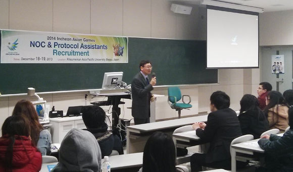 2014 인천아시안게임조직위원회(위원장 김영수)가 18일과 19일 양일간 일본 벳부의 리츠메이칸 아시아태평양 대학교(총장 고레나가 슌·이하 APU)를 방문해 인천아시안게임 통역전문요원 설명회와 현장접수를 진행했다.