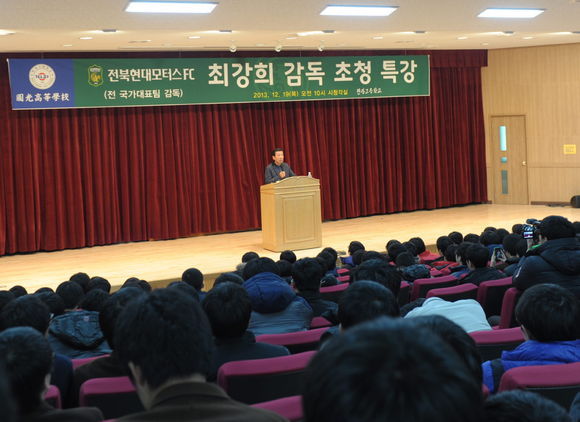 최강희 전북 현대(단장 이철근) 감독이 전라북도 익산시 원광고등학교(교장 한은수)를 방문해 학생 400여 명을 대상으로 '목표와 꿈 그리고 노력'이란 주제로 특강을 펼쳤다.