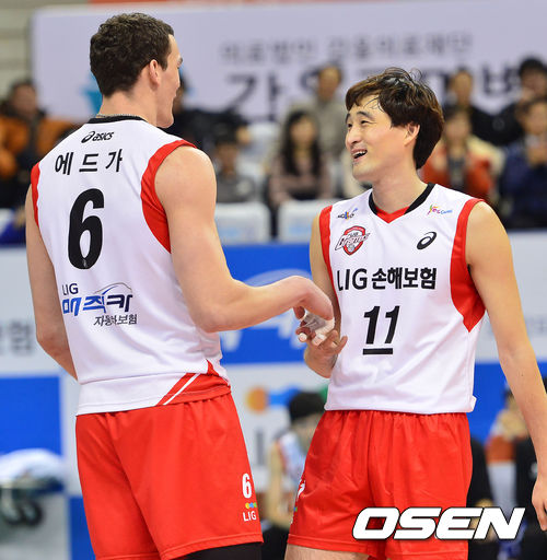 19일 오후 경북 구미 박정희체육관에서 열린 2013-14시즌 NH농협 V리그 남자부 LIG손해보험과 대한항공의 경기, 2세트 LIG 에드가와 이경수가 공격 성공후 이야기를 나누고 있다
