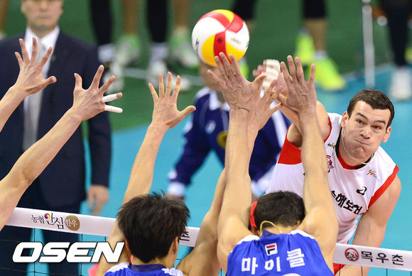 19일 오후 경북 구미 박정희체육관에서 열린 2013-14시즌 NH농협 V리그 남자부 LIG손해보험과 대한항공의 경기, 2세트 LIG 에드가가 강타를 날리고 있다.