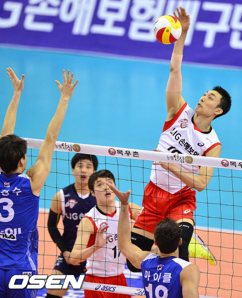 19일 오후 경북 구미 박정희체육관에서 열린 2013-14시즌 NH농협 V리그 남자부 LIG손해보험과 대한항공의 경기, 2세트 LIG 하현용이 강타를 날리고 있다.