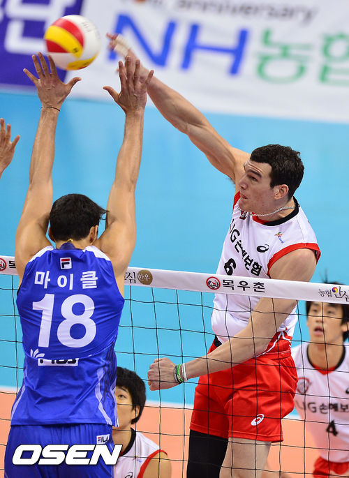 19일 오후 경북 구미 박정희체육관에서 열린 2013-14시즌 NH농협 V리그 남자부 LIG손해보험과 대한항공의 경기, 2세트 LIG 에드가가 강타를 날리고 있다.