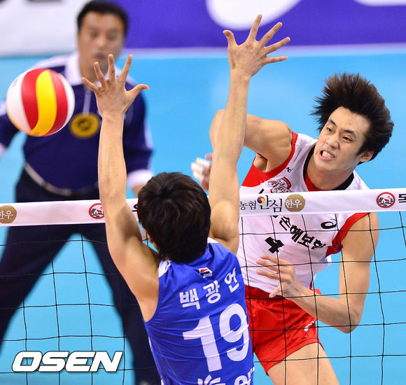 19일 오후 경북 구미 박정희체육관에서 열린 2013-14시즌 NH농협 V리그 남자부 LIG손해보험과 대한항공의 경기, 1세트 LIG 이강원이 강타를 날리고 있다.
