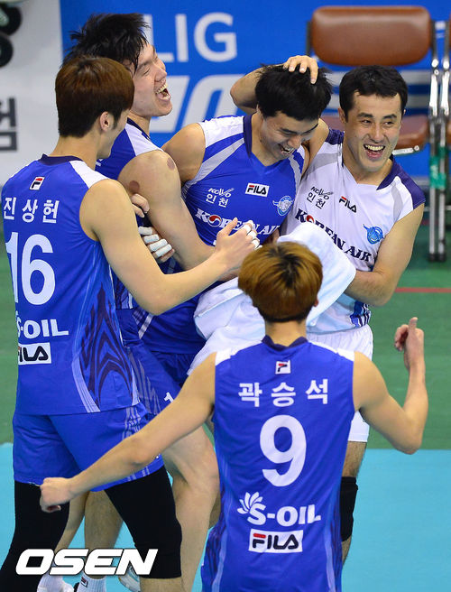 19일 오후 경북 구미 박정희체육관에서 열린 2013-14시즌 NH농협 V리그 남자부 LIG손해보험과 대한항공의 경기, 1세트 대한항공 김형우가 블로킹 성공후 동료들의 축하를 받고 있다.
